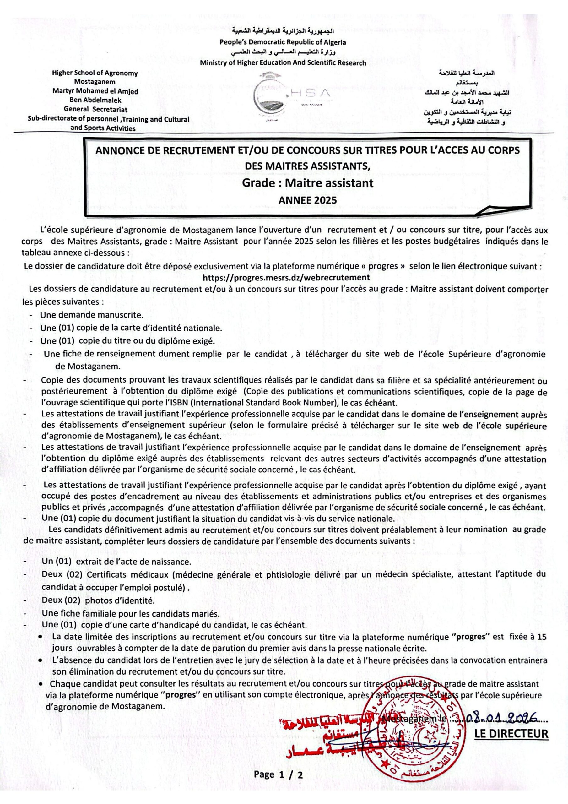 l’Ecole Supérieure d’Agronomie de Mostaganem recrute des enseignants